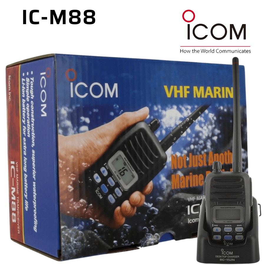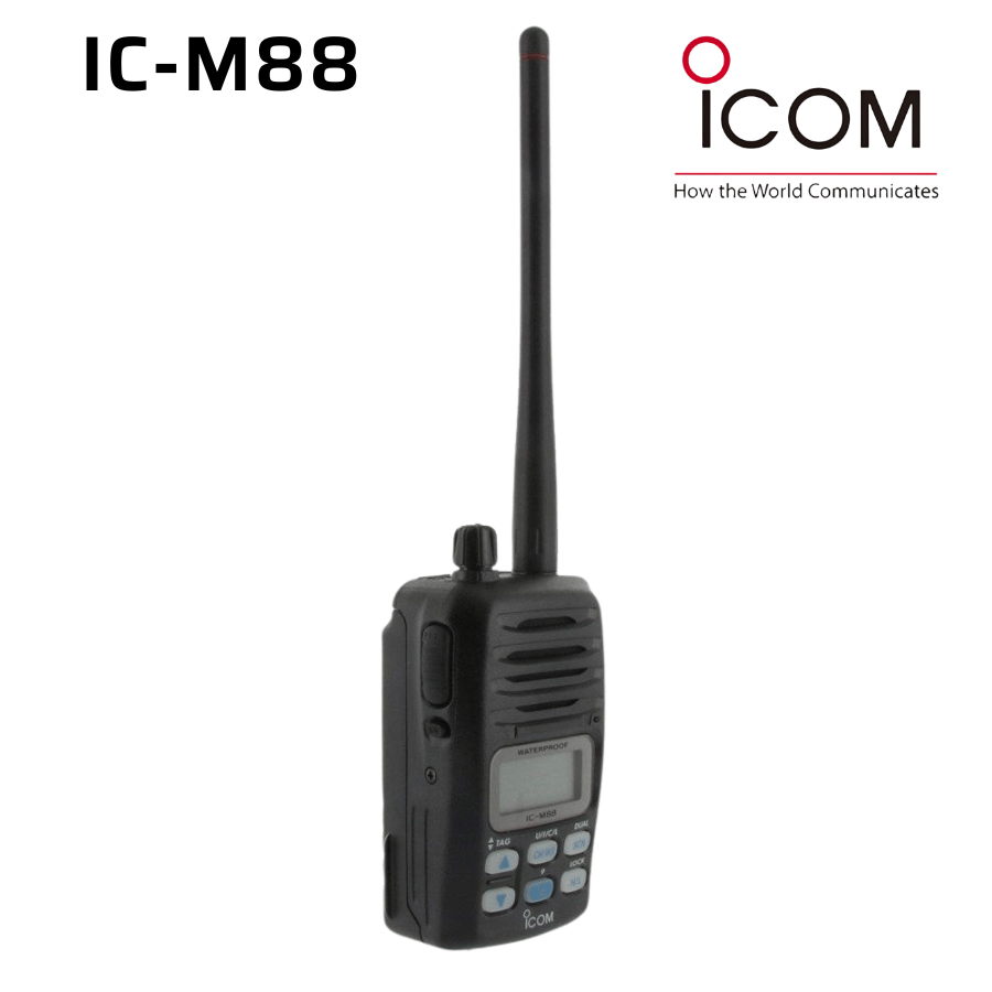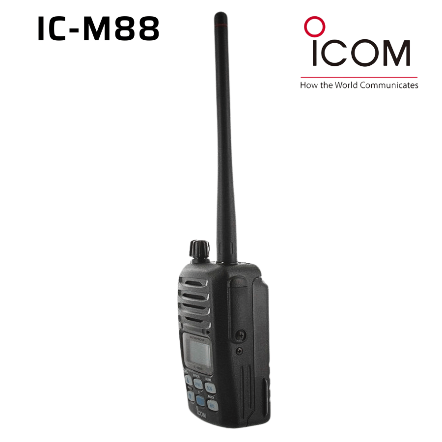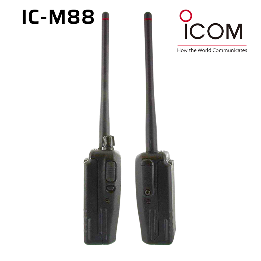 Bộ đàm cầm tay Icom IC-M88, bộ đàm hàng hải ‘siêu bền’ với công suất 5W và chuẩn chống nước IPX7. Tích hợp 22 kênh PMR đường bộ và tùy chọn chống cháy nổ an toàn. Liên lạc thông suốt 15 giờ liên tục, bất chấp mọi điều kiện thời tiết khắc nghiệt.”