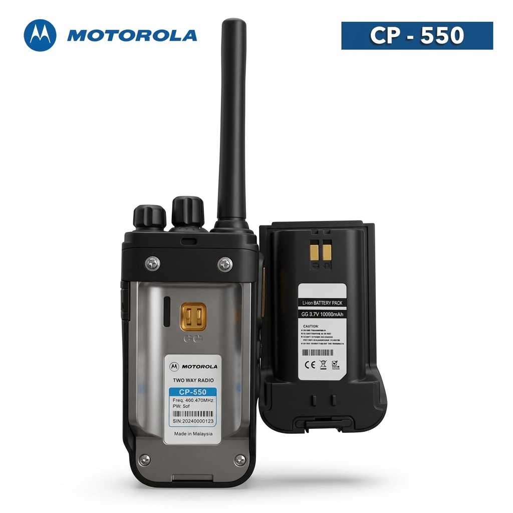 Bộ đàm cầm tay Motorola CP-550 Sở hữu thiết kế bền bỉ cùng công suất phát 5W mạnh mẽ đảm bảo tín hiệu xuyên thấu cực tốt và âm thanh rõ nét ngay cả trong môi trường nhiều tạp âm. Dung lượng pin 10000 mAH và 16 kênh chống nhiễu, đây là lựa chọn hàng đầu cho các nhà hàng, khách sạn và công trường xây dựng.
